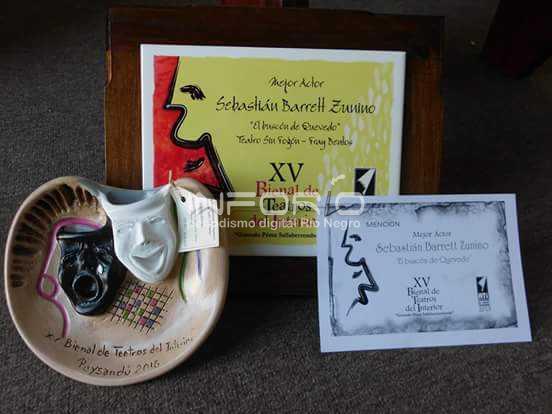 “Uno siempre va con el objetivo, con las ansias de presentarse de hacer lo que a uno le gusta. Lo que viene después son lindos momentos, y es como un mimo a un gran esfuerzo que hacemos todos. Máxime en esta obra que particularmente me costó mucho trabajo. En esta oportunidad nosotros participamos de las nueve obras que habían sido seleccionadas en la etapa previa que fue el regional de teatro. Esta bienal cumplida en Paysandú fue la número quince. A nosotros nos tocó presentarnos el último día y a última hora. Para nosotros fue actuar con una presión mayor porque el día anterior ya habíamos sido distinguidos con el premio. Fue también un premio a la dirección y a mi compañera Silvia que comparte conmingo esta obra” (Fotos extraídas del Facebook personal de Sebastián Barret)