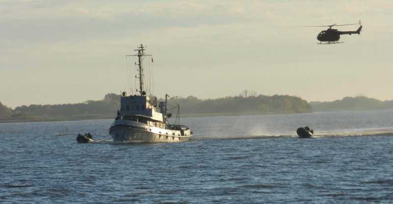 La Armada Nacional informa que durante la Operación Rio Revuelto que lleva a cabo el Comando de la Flota con la incorporación de la Prefectura Nacional Naval, en el Rio Uruguay próximo a Casa Blanca (departamentos de Paysandú y Rio Negro), mientras se realizaban diversos patrullajes, se constató la presencia de personas indocumentadas con armamento sin documentación que compruebe su procedencia y propiedad. De igual forma se encontró a pescadores que realizaban pesca ilegal en proximidades del arroyo Negro. Las personas detenidas y el armamento incautado fueron puestos a disposición del magistrado competente de Fray Bentos.