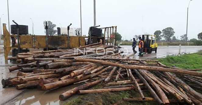 Próximo a las 17hs se registró un siniestro de tránsito en la rotonda de ruta 2 y 24, donde un camión volcó la zorra que llevaba cargada de madera.