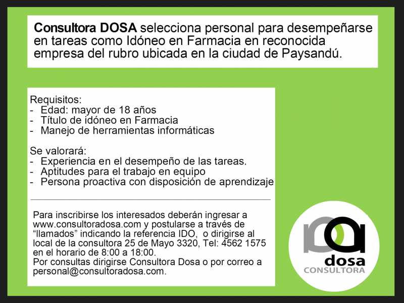 Consultora DOSA realiza un llamado a personal para desempeñarse como idóneo en farmacia en reconocida empresa del rubro de Paysandú.