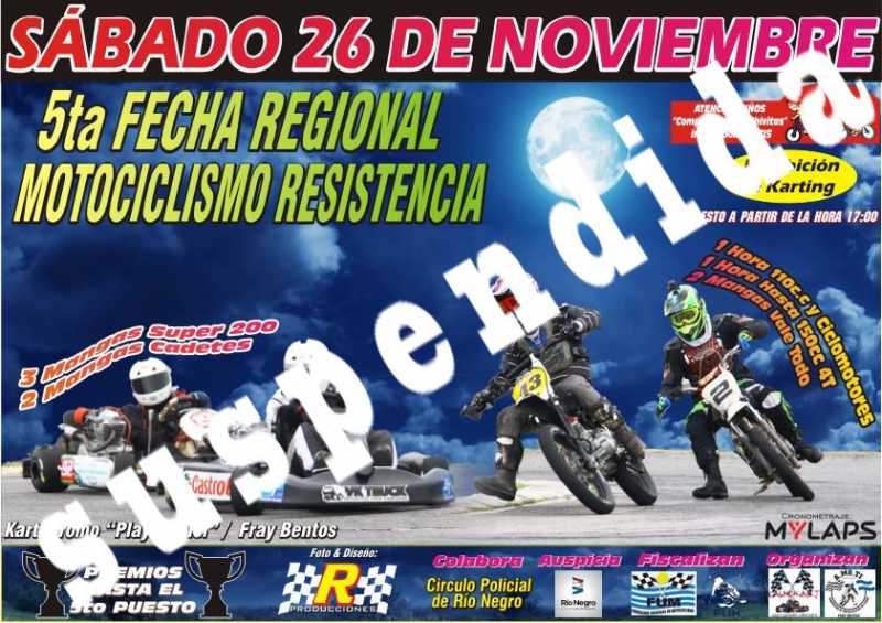 Las autoridades de AMOTI y CAUMOKART comunican que se suspende la actividad programada para hoy sábado, a partir de las 17:00 horas, por las inclemencias del tiempo y el pronóstico extendido por INUMET, con alerta naranja para esta parte del país. Además fijaron las nuevas fechas: