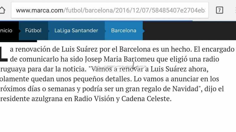 “Se va a renovar con Suárez ahora. Quedan sólo unos pequeños detalles. Pero Luis va a seguir en el Barcelona. Es un hombre muy querido por todos y él quiere mucho al club. En los próximos días, semanas, lo anunciaremos. Quizás, por qué no, como un gran regalo de Navidad. No para Luis, que ya sabe que va a seguir aquí, sino para los aficionados al fútbol. Para ellos es un personaje importantísimo, que forma parte de este tridente tan espectacular que tenemos en el club, que ayudan a que todo funcione en el equipo”, sentenció Bartomeu, que reconoció la duración del contrato que tendrá el atacante uruguayo.