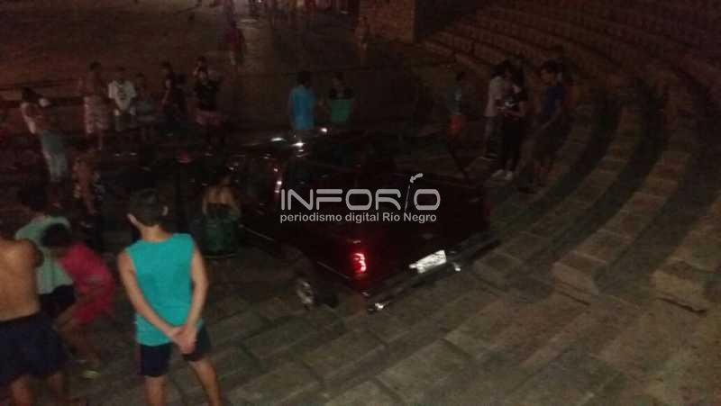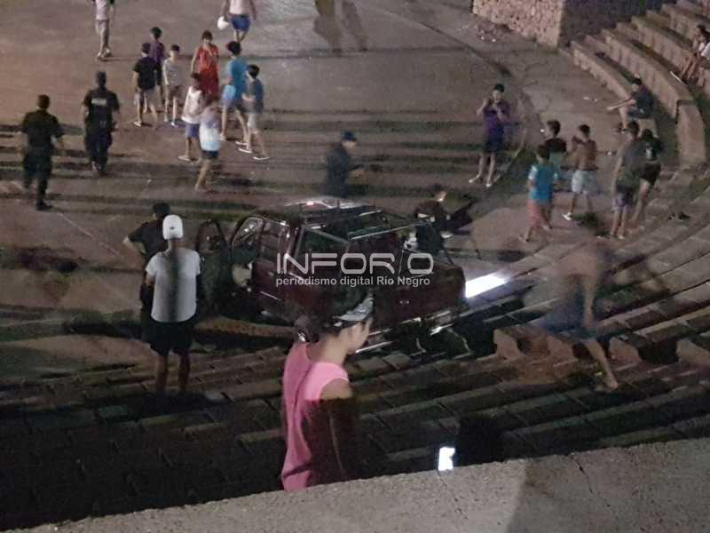 Hace minutos ocurrió un inexplicable e insólito siniestro de tránsito ya que una camioneta cayó por la escalera del teatro de verano.