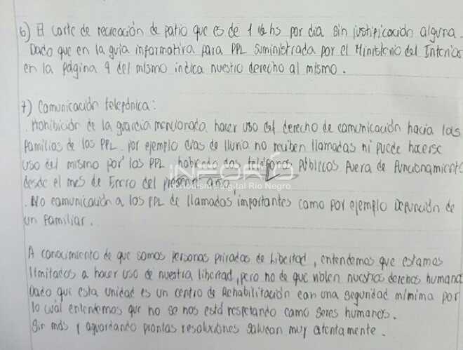 En la carta acercada a InfoRIO fechada 26 de marzo los reclusos exponen una serie de puntualizaciones donde denuncian que se dan “Situaciones no humanas que se están viviendo en la unidad”. Entre el detalle se establece que hay una mala aplicación de los procedimientos, existiendo diferentes criterios y falta de voluntad para revertir las situaciones. Además se manifestó que "la unidad está superpoblada".