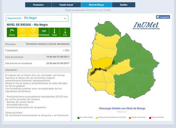 El INUMET emitió una advertencia amarilla para los departamentos de Salto, Paysandú, Río Negro, Soriano, Colonia, San José, Flores y Durazno por tormentas intensas y lluvias abundantes.