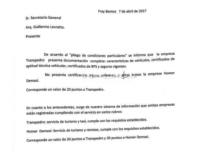 La cotización de Transpedro fue de 18 mil pesos más IVA (19.800 pesos) por viaje, en tanto Homer Demasi cotizó 27 mil pesos más IVA (29.700 pesos) por viaje; de modo tal que Transpedro obtuvo 50 puntos y Homer Demasi 30 puntos.