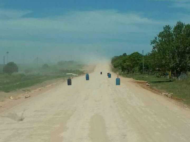 En este caso un camionero que habitualmente circula por allí nos envió una fotografía donde se puede apreciar más de media docena de baldes de 20 litros que están en la ruta con el objetivo que quienes por allí circulan disminuyan la velocidad y no levanten polvo.