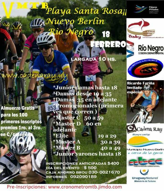 Desde las 10 de la mañana se largan las competencias de Montain Bike, en la zona del Parador "Santa Rosa" de la villa de Nuevo Berlín, con gran inscripción previa. Se espera llegar al centenar de competidores, donde hay "Almuerzo gratis" para los 100 primeros inscriptos y muchos premios que se repartirán, en las 10 categorías distintas del evento.