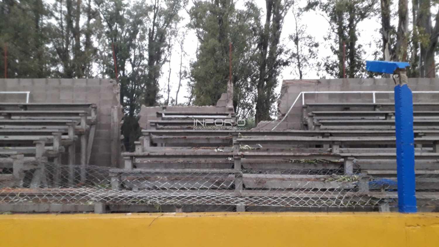 Con un despliegue muy importante de funcionarios de la Intendencia de Río Negro, se trabajó en el retiro de un árbol de gran porte que cayó sobre la cancha, afectando el muro y la nueva tribuna sobre calle Guillermo Lynch.La inestabilidad del clima y por momentos la lluvia, no impidieron que se lograra sacar el a&...