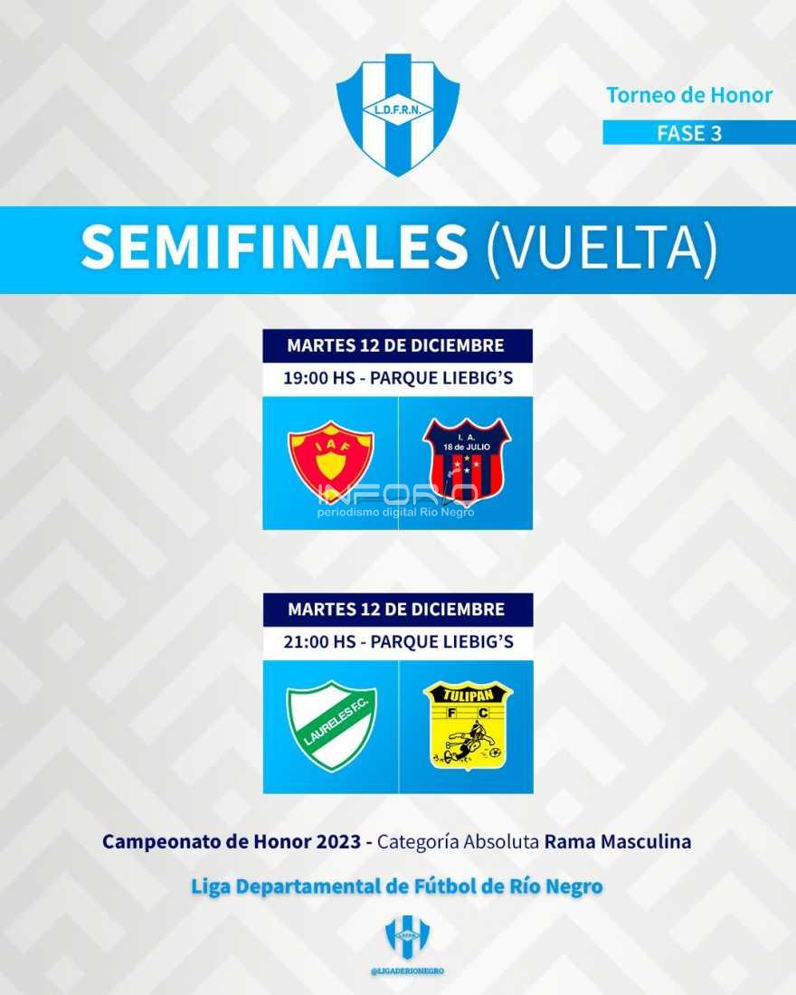 Se fijaron los detalles por parte de la Divisional A y del Grupo Técnico Arbitral del balompié fraybentino, lo que será las primeras Semifinales del Torneo de Honor 2023 y éstos son:Domingo 03/12 - estadio: Parque Liebig´s19:00 hs. LAURELES vs. TULIPAN