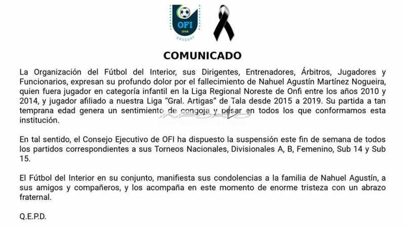 Se suspendió el fútbol a nivel nacional, tanto en OFI como en AUF, tras el insuceso del joven cito de 17 años de Boston River que en un partido de 3ª división, Agustín Martínez sufriera un infarto y posteriormente falleciera (muerte súbita).Aquí en Fray Bentos, la Liga tambi&eacu...