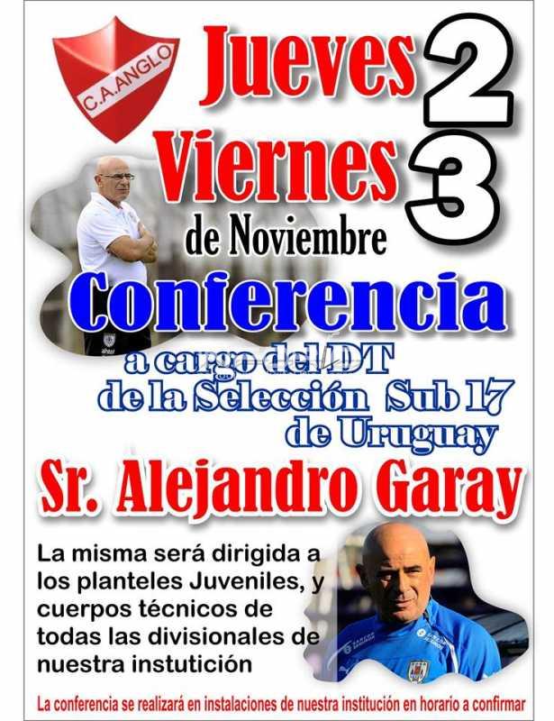 Esta tardecita sobre las 18:00 horas, estará en la sede del Club Atlético Anglo, el actual seleccionador Celeste de Sub 17 Alejandro Garay. Se realizará allí una Conferencia de Prensa y luego dictará una Charla en a los planteles Juveniles y Entrenadores de la institución albirroja.