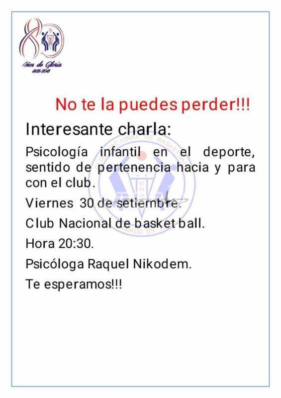 Este viernes 30 de setiembre, en los altos del Club Nacional de BB, en forma gratuita y dirigida a todo público (Entrenadores, padres, niños y niñas), la Psicóloga Raquel Nikodem estará brindando una muy interesante charla (profesional que ya estuviera en la institución con muy buena aceptación y ...
