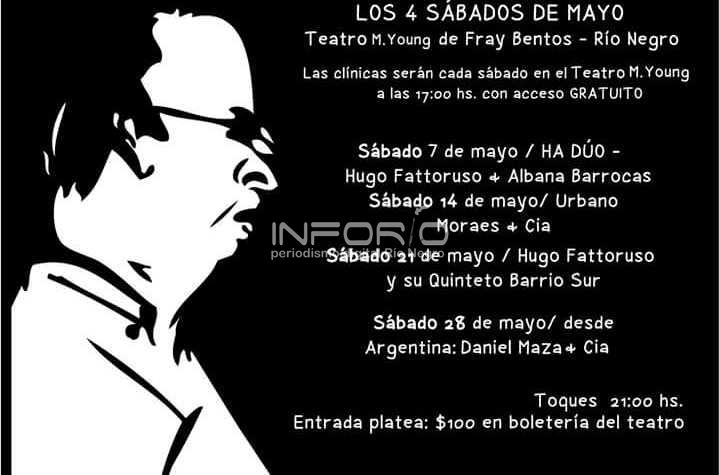 Centros MEC Río Negro, anunció que en Fray Bentos el se realizará el "1er Homenaje a Osvaldo Fattoruso en Uruguay". Serán los 4 sábados de mayo en el teatro Miguel Young. Se desarrollarán clínicas más conciertos. Las clínicas serán a las 17hs con acceso gra...