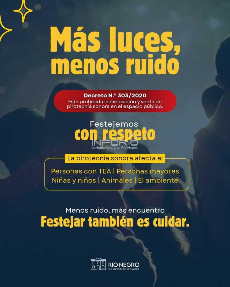 La Intendencia de Río Negro recuerda que se encuentra vigente el Decreto N.º 303/2020, aprobado por la Junta Departamental de Río Negro, que prohíbe la exposición y venta de pirotecnia sonora en el espacio público.En el marco de las celebraciones de fin de año, se invita a la comunidad a optar p...