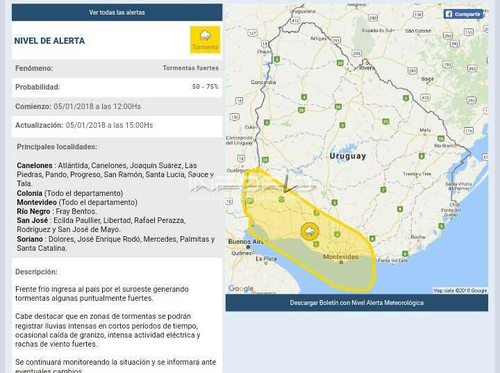 El INUMET emitió este mediodía una advertencia meteorológica de color amarillo para la zona costera litoral sur y que llega hasta Fray Bentos por tormentas fuertes. Fenómeno: Tormentas fuertes Probabilidad: 50 - 75% Comienzo: 05/01/2018 a las 12:00Hs Actualización: 05/01/2018 a l...