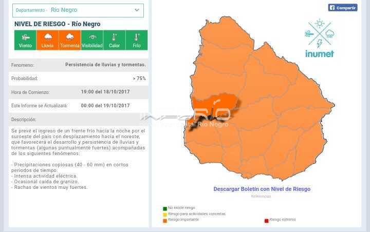 El INUMET emitió en más primeras horas de este martes un boletín con nivel de riesgo naranja para 11 departamentos, dentro de los cuales se encuentra Rio Negro. La alerta naranja es por lluvias y tormentas, y se extiende hasta las 15hs, momento en el que se actualizará. Además hay 5 departamentos ...