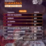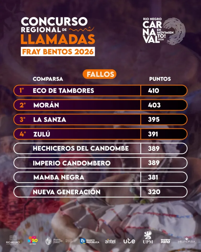 El Jurado que actuó en el Concurso Regional de Llamadas de Fray Bentos emitió el siguiente fallo: 1° Eco de Tambores con 410 puntos; 2° Morán con 403 puntos; 3° La Sanza con 395 puntos; 4° Zulú con 391 puntos; 5° Hechiceros del Candombe e Imperio Candombero con 389 puntos; 6° Mamba Negra con 381 puntos y 7° Nueva Generación con 320 puntos.