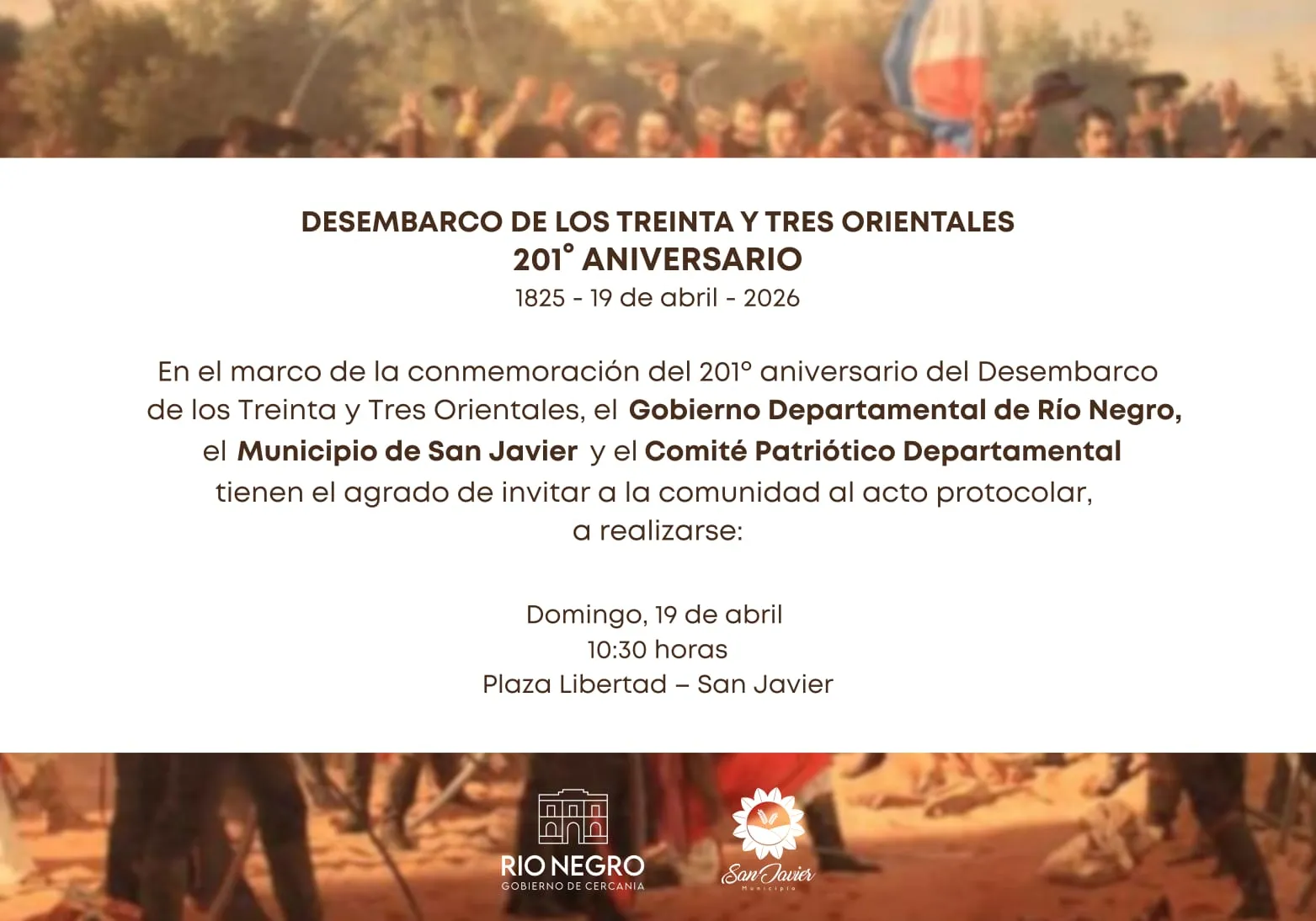 En el marco de la conmemoración del 201° aniversario del Desembarco de los Treinta y Tres Orientales, el Gobierno Departamental de Río Negro, el Municipio de San Javier y el Comité Patriótico Departamental invitan a la comunidad a participar del acto protocolar que se realizará el próximo domingo 19 de abril.