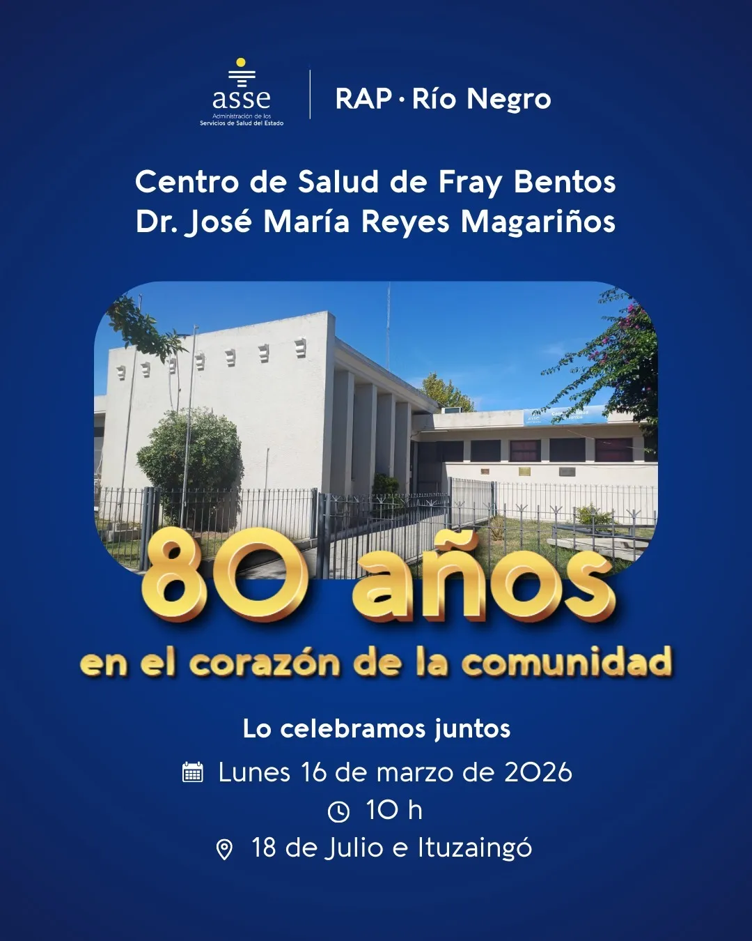 El Centro de Salud de Fray Bentos Dr. José María Reyes Magariños, perteneciente a la Red de Atención Primaria (RAP) de Río Negro de ASSE, celebra sus 80 años de trayectoria al servicio de la comunidad.