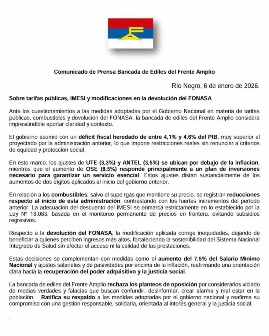 Ante los cuestionamientos a las medidas adoptadas por el Gobierno Nacional en materia de tarifas públicas, combustibles y devolución del FONASA, la bancada de ediles del Frente Amplio considera imprescindible aportar claridad y contexto. El gobierno asumió con un déficit fiscal heredado de entre 4,1% y 4,6% del PIB, muy superior al proyectado por la administración anterior, lo que impone restricciones reales sin renunciar a criterios de equidad y protección social. En este marco, los ajustes de UTE (3,3%) y ANTEL (3,5%) se ubican por debajo de la inflación, mientras que el aumento de OSE (8,5%) responde principalmente a un plan de inversiones necesario para garantizar un servicio esencial. Estos ajustes distan sustancialmente de los aumentos de dos dígitos aplicados al inicio del gobierno anterior. En relación a los combustibles, salvo el super gas que mantiene su precio, se registran reducciones respecto al inicio de esta administración, contrastando con los fuertes incrementos del período anterior. La adecuación del descuento del IMESI se enmarca estrictamente en lo establecido por la Ley N° 18.083, basada en el monitoreo permanente de precios en frontera, evitando subsidios regresivos. Respecto a la devolución del FONASA, la modificación aplicada corrige inequidades, dejando de beneficiar a quienes perciben ingresos más altos, fortaleciendo la sostenibilidad del Sistema Nacional Integrado de Salud sin afectar el acceso ni la calidad de las prestaciones. Estas decisiones se complementan con medidas como el aumento del 7,5% del Salario Mínimo Nacional y ajustes salariales y de pasividades por encima de la inflación, reafirmando una orientación clara hacia la recuperación del poder adquisitivo y la justicia social. La bancada de ediles del Frente Amplio rechaza los planteos de oposición por considerarlos viciados de medias verdades y falacias que buscan confundir, desinformar, crear alarma y mal estar en la población. Ratifica su respaldo a las medidas adoptadas por el gobierno nacional y reafirma su compromiso con una gestión responsable, solidaria, orientada al interés general y la justicia social.
