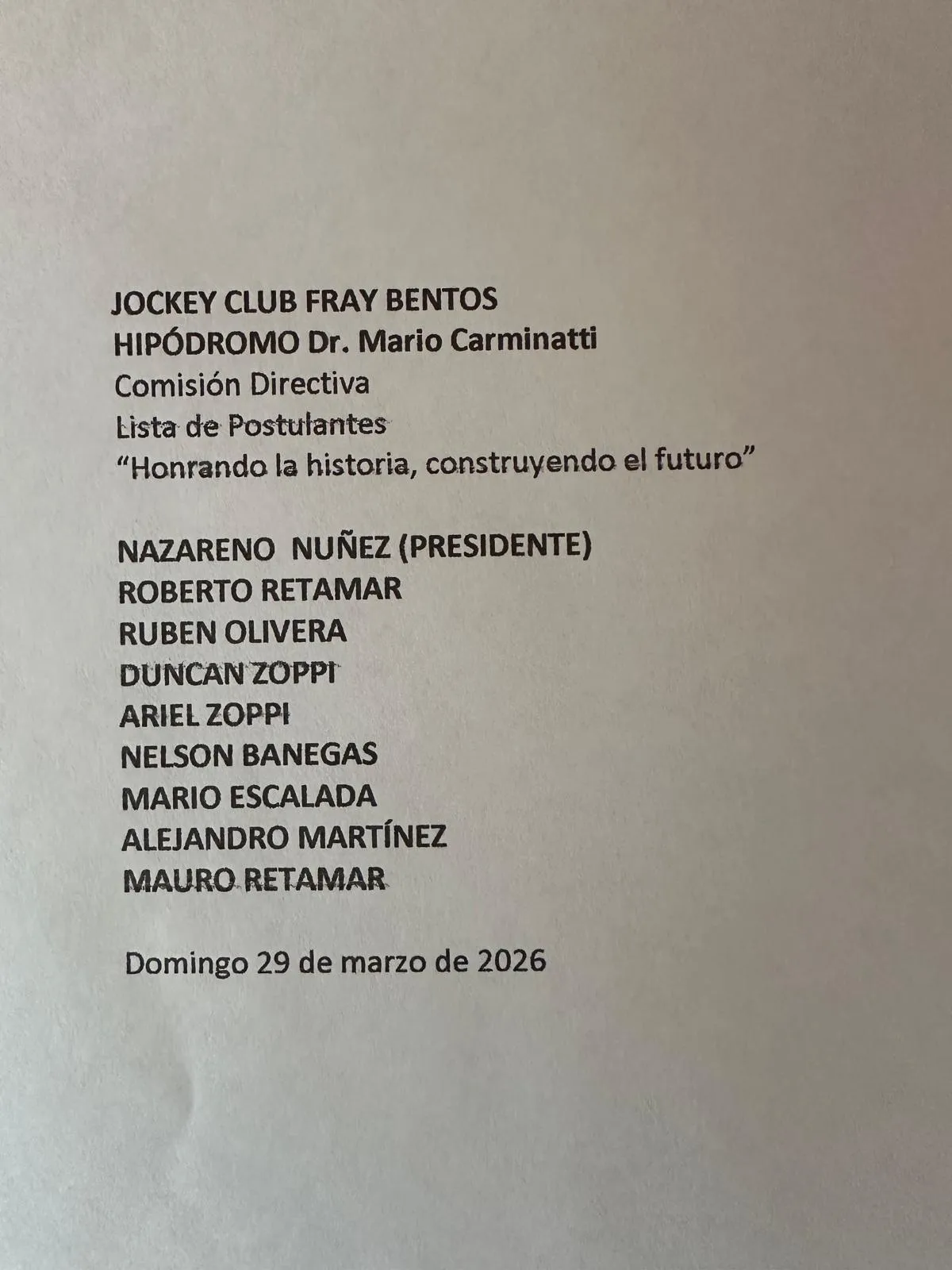 Jockey Club Fray Bentos , de acuerdo al Art.29 de los Estatutos de la Institución , convoca a sus Socios activos a la Asamblea Ordinaria que se realizará el sábado 29 de marzo de 2026 a la hora 10.30 , como primer llamado y hora 11 como segundo llamado en las instalaciones del Hipódromo Mario Carminatti para tratar el siguiente orden del día: