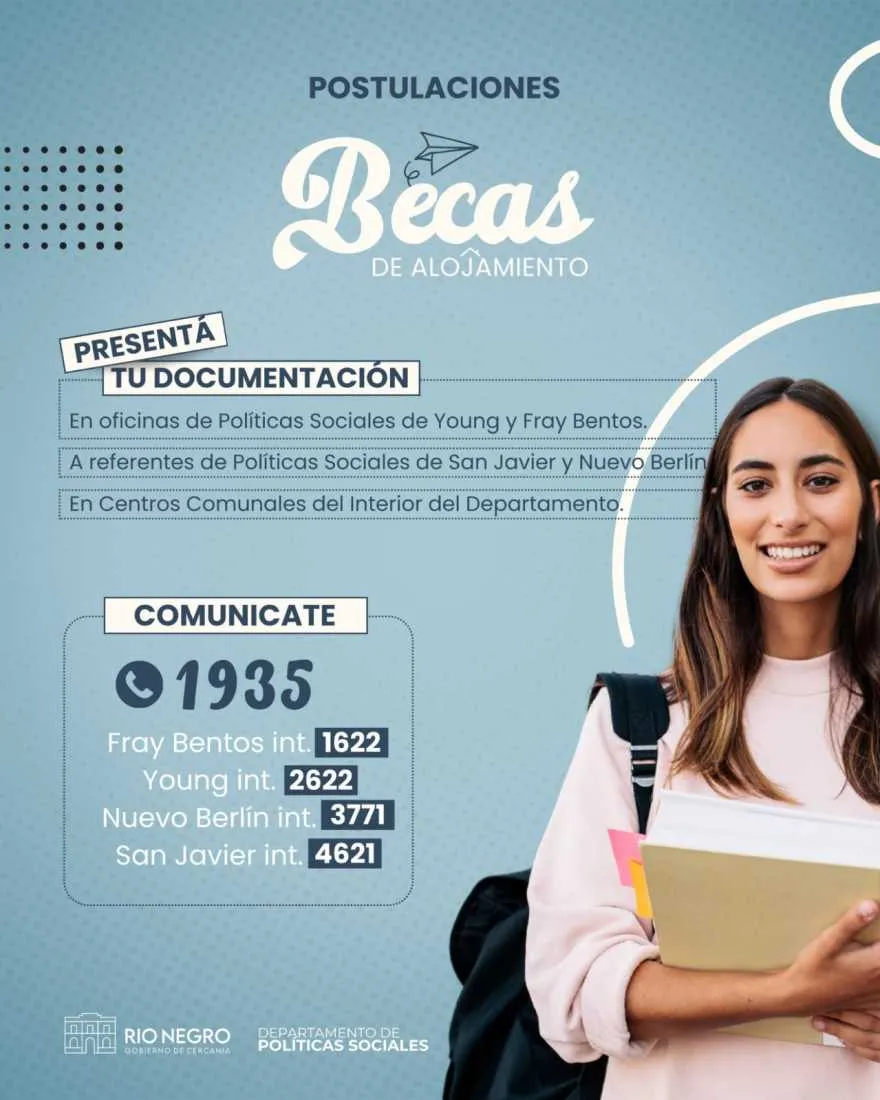El próximo 20 de enero vence el plazo para postular a las Becas de Alojamiento 2026, un programa que acompaña a estudiantes del departamento que deben trasladarse a otras localidades para continuar su formación educativa. La propuesta contempla cupos en los hogares estudiantiles de Fray Bentos, Young, Grecco y Montevideo. Los interesados podrán presentar la documentación requerida y completar su solicitud, tanto para nuevos ingresos como para renovaciones. Los requisitos, formularios se encuentran disponibles en el sitio web de la Intendencia de Río Negro, a través del siguiente enlace: https://www.rionegro.gub.uy/gabinete-2025-2030/politicas-sociales/becas-de-alojamiento/