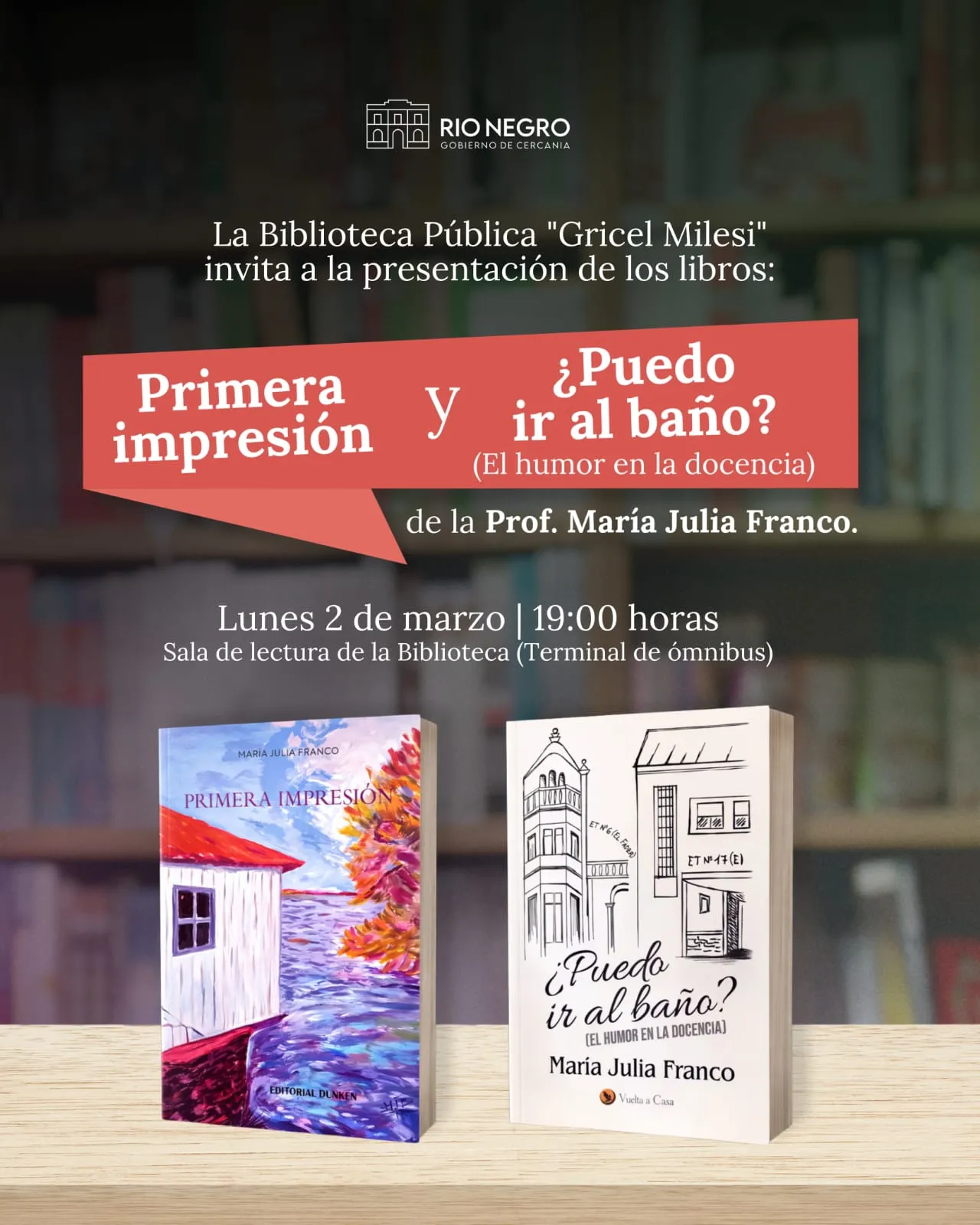 La Biblioteca Pública “Gricel Milesi” de Fray Bentos invita a la presentación de dos libros de la Prof. María Julia Franco. Uno se llama “Primera impresión” y el segundo libro se titula: “¿Puedo ir al baño? (El humor en la docencia).