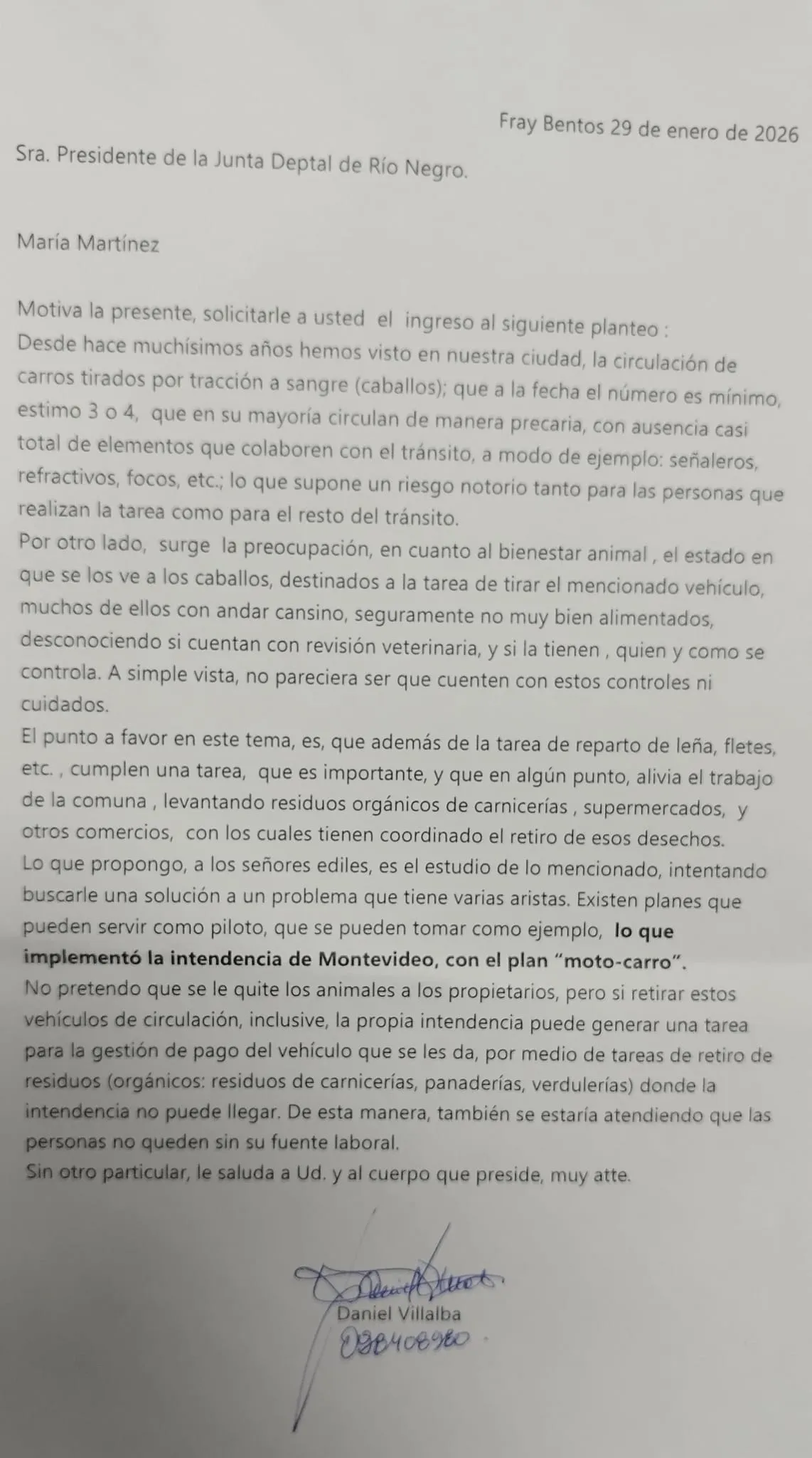 Dentro de la argumentación que realiza el ex edil del Partido Nacional Daniel Villalba, manifiesta que desde hace muchos años se ha visto en Fray Bentos la circulación de carros tirados por caballos, que a la fecha el número es mínimo, estima 3 o 4, que en su gran mayoría circulan de manera precaria, con ausencia casi total de elementos que colaboren con el tránsito como señaleros, refractivos, focos, lo que supone un riesgo notorio, tanto para las personas que realizan la tarea, como para el resto del tránsito.