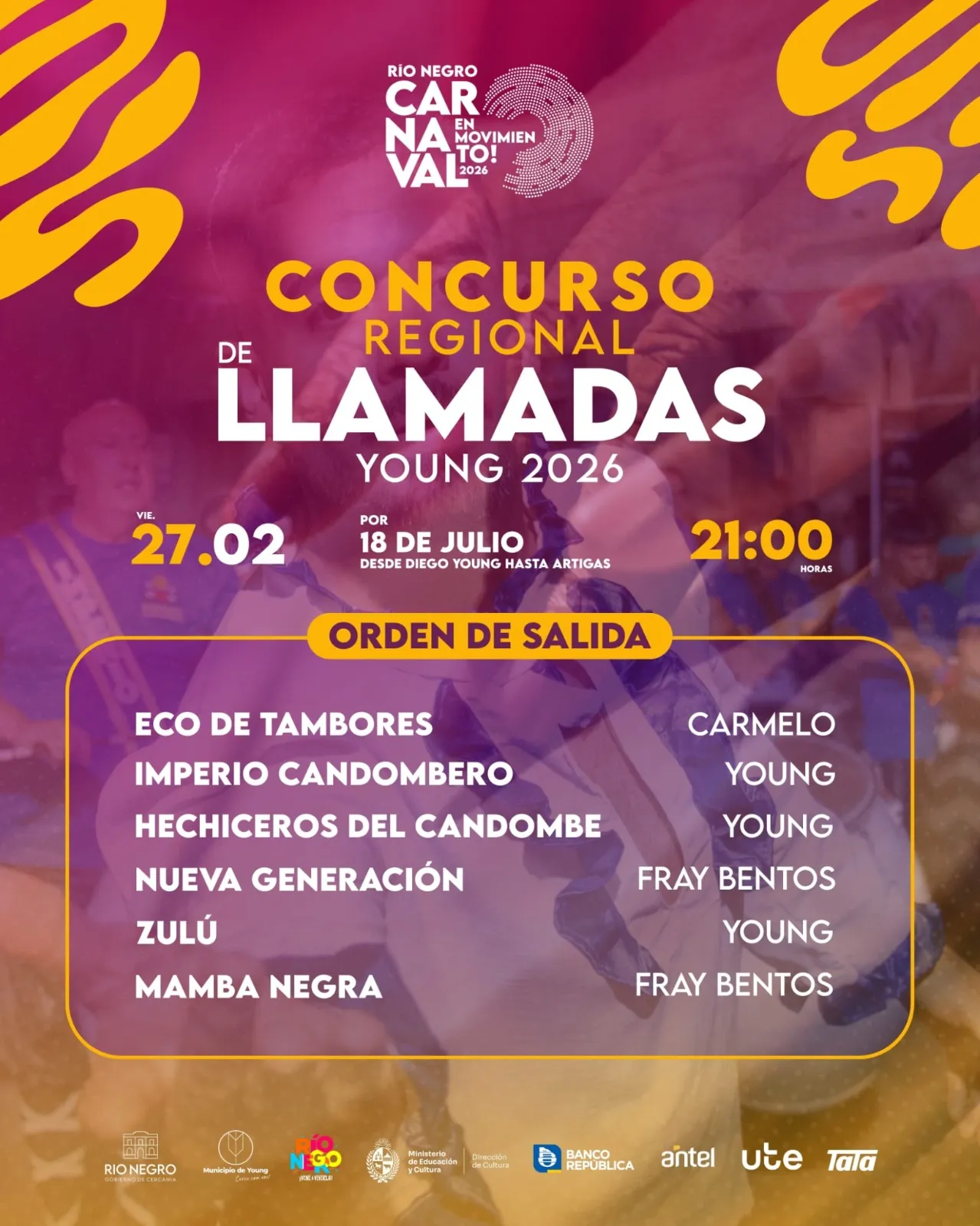 En el marco de Río Negro Carnaval en Movimiento 2026, este viernes 27 de febrero, a partir de las 21:00 horas, se desarrollará en la ciudad de Young el esperado Concurso Regional de Llamadas.
