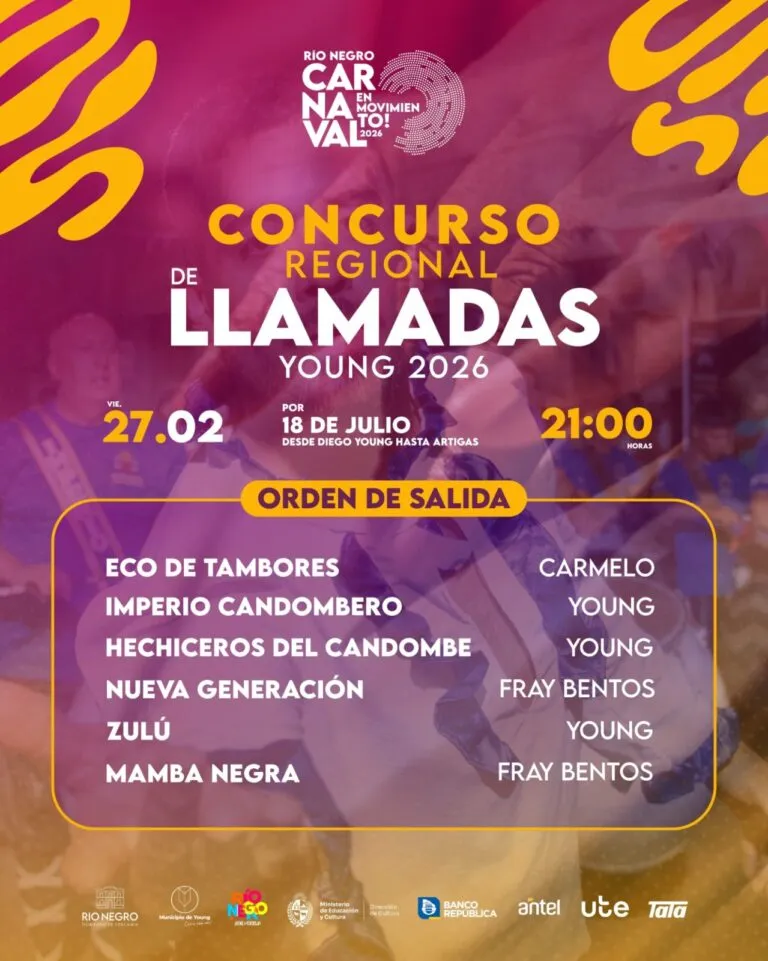 En el marco de Río Negro Carnaval en Movimiento 2026, este viernes 27 de febrero, a partir de las 21:00 horas, se desarrollará en la ciudad de Young el esperado Concurso Regional de Llamadas. El desfile recorrerá 18 de Julio, desde Diego Young hasta Artigas,…