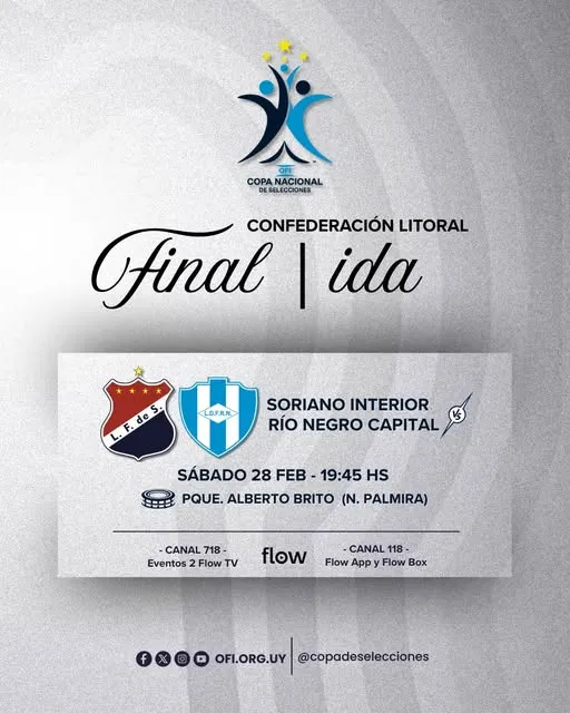 La selección Albiceleste de categoría Absoluta viaja este sábado a Nueva Palmira para enfrentar a Soriano Interior por la Final de Ida del Litoral. Río Negro Capital buscará en el Parque Alberto Brito traerse un resultado positivo para luego definirse "en casa". Otra final del Litoral para la Albiceleste que irá en DIRECTO por TV, a través de OFI TV y pr todo el mundo por Flow TV.El encuentro está fijado para la hora 19:45 con Árbitros Ecilda Paullier encabezados por Marcos Beltrán, Carlos Montes, Alvaro Moreira Petrosino y Javier Ingol. Río Negro definirá como local en el estadio Parque Liebig´s, el próximo sábado 7 hora 19:00 donde se definirá el Campeón.